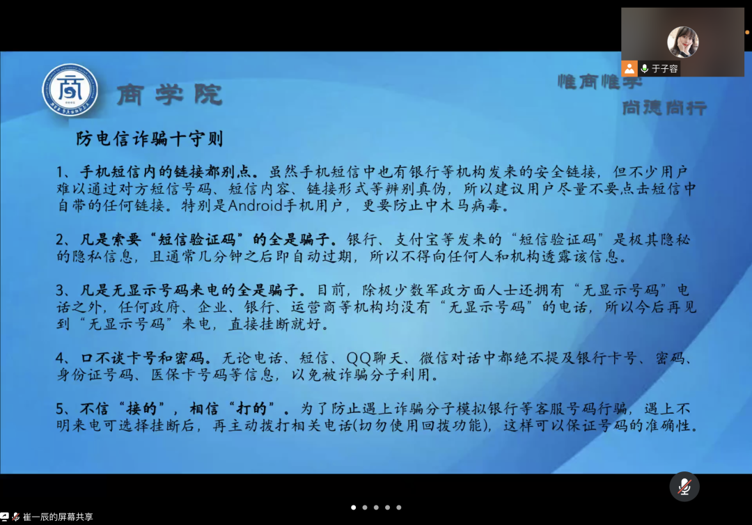 会议中,各位辅导员老师提醒同学们时刻绷紧疫情防控这根弦,保持高度警惕,注重自我防护,减少外出聚集,把常态化防控措施融入日常生活,同时希望家长起到督促作用。针对学生寒假期间生活,辅导员老师建议学生劳逸结合,提倡学生假期在家参与家务劳动,积极参与社会实践和实习工作,为以后就业打下基础。各位辅导员老师还结合现实事例在会议中也提醒大家谨防诈骗,普及了预防网络诈骗、电信诈骗的相关知识。各位辅导员老师还对桃子视频
