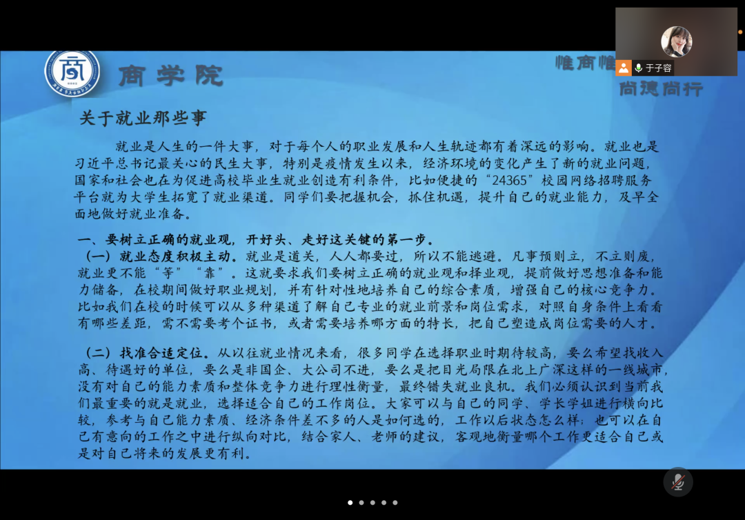 在2019级家长会上,辅导员于子容老师针对2019级本科生所处的大学生涯的重要时间节点,从同学们关于升学和就业的两个选择角度向学生和家长都提出了宝贵的意见和建议。对于有意向考研的同学,应明确目标,把握寒假时间,做好时间管理,家长则在其中起到督促和陪伴作用,做考研学生最有力的后盾。对于选择就业的同学,应利用假期补充完善个人简历,积极参与社会实践,家长应与学生开诚布公地探讨职业目标,并利用家长的人生经验助力学生更好地达成就业目标。