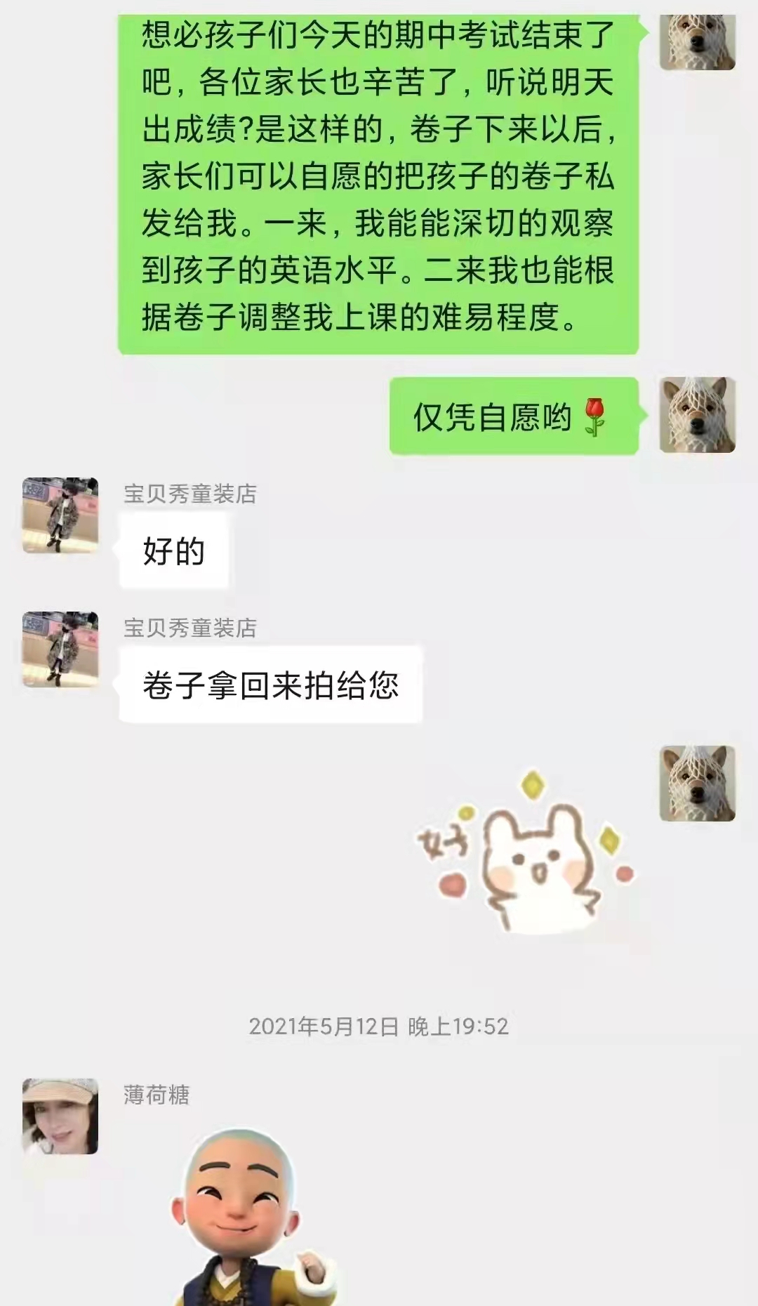 支教的经历却也令我感到惶恐不已。期末将临,我为了找到班上其中一位孩子成绩停滞不前的原因,询问孩子家长是否能将孩子的考试卷子拍照传过来,孩子家长爽快的答应了。我两三眼扫完发过来的卷子,将问题与提升方向告诉孩子家长后,对方却出乎我意料的连连道谢,其热情之猛烈实是令人无法招架。原来孩子家长为孩子英语成绩苦恼已久,可平日忙于工作,对孩子是心有余而力不足,而我对于孩子问题的分析,虽然比较粗糙和浅显,却足以让对方眼前一亮。在此之后,我常常反思自己是否够资格担下孩子家长们的感激,我开始试着尽可能的多了解孩子们的学习心态和学习方法,进一步的掌握他们的状况。我想让他们的家长知道,如今在线上还有一位小老师在为他们的孩子着想。