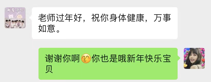 在支教活动中,最困难的事情便是与小朋友家长们的沟通。这是支教的第一步,也是最重要的一步,线上的支教需要家长的配合和及时沟通,方便我们随时掌握孩子的学习状态,及时更改教学计划。我依然记得联系一位家长时,尽管我解释了自己的身份、介绍了支教活动,但是家长仍然觉得有诈骗的嫌疑,不怎么相信,所幸小朋友在电话那端赶紧给家长说明情况,才得以成功对接。听着孩子在电话那端替我解释,了解情况后家长立即表示对我的感谢,即使还没有开始上课。但每每到这个时候,就觉得身上的担子格外的重,甚至觉得如果我的课对小朋友没有帮助都辜负了家长们的信任。这也是我在支教中觉得最热血的部分吧。特别是在春节的时候,支教已经结束了,相隔万里,但我却收到了小朋友们的祝福,我在家里赶紧跟家人炫耀,“你看,我的小朋友还记得我呢”,这种能被家长和小朋友信任的感觉是其他活动无法带来的。