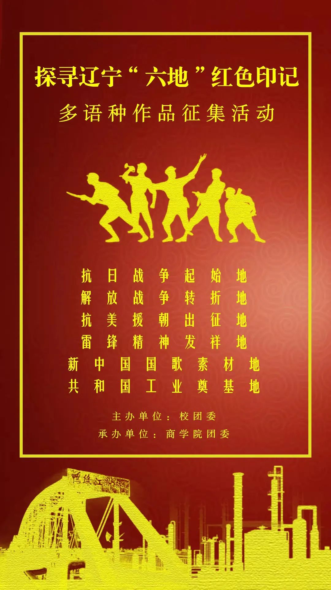 为深入阐释辽宁“六地”的丰富内涵和时代价值,传承红色基因,赓续精神血脉,依托我校以外语为主,国际化办学的特色,开展探寻辽宁“六地”红色印记多语种作品征集,通过活动引导大外学子追寻辽宁红色足迹,传承革命精神,厚植爱国主义情怀,用专业知识展现青春风采。