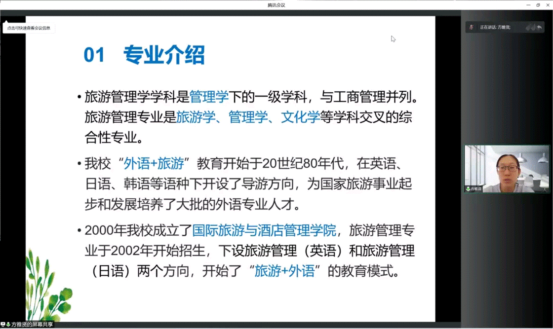 会议伊始,首先由方雅贤老师向同学们介绍了我校旅游管理专业的历史、招生情况、专业特色、以及我院注重国际型、应用型、复合型人才的培养方案、就业前景等情况。随后白子英学长、苗光瑶学长、唐占璐学姐为同学们详细介绍了大学学习的方法、校园生活、参赛活动、人际交往等方面,并对同学们表达了美好的祝愿。