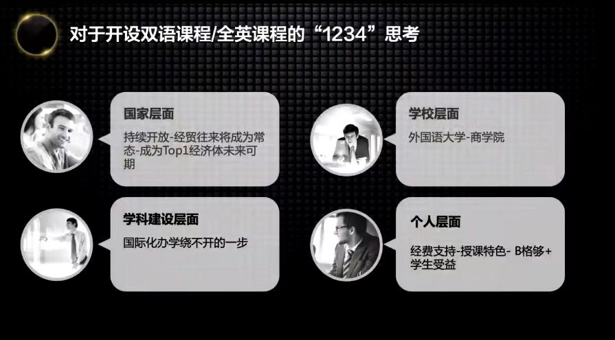 的发展新定位,分专业、有计划地逐步推进双语和全英课程建设,在给予一定的配套制度,形成制度保障下的激励相容。