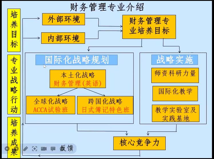 财务管理专业在参考分析内外部环境基础之上,明确了围绕外语语言服务国家战略的使命,响应“一带一路”倡议,构筑“外语语言+学历教育+国际职业资格”的国际型、复合型、应用型财务管理人才的目标,利用“外语优势”进行授课,培养学生的核心竞争力。
