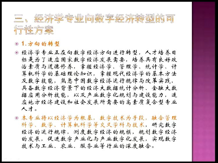 经济学专业分析了当今时代经济发展的潮流,着眼于国家“十四五”期间数字经济发挥的重要作用,领悟到数字产业化和产业数字化将成为今后一段时期的经济发展的主要动力。进一步搭建数字经济平台,推进实验室建设,培养复合型、应用型人才是目前重中之重。