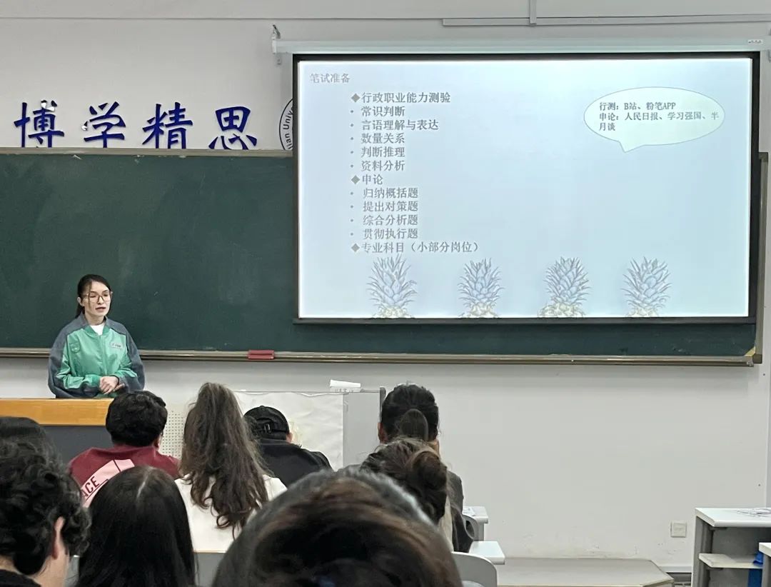本次分享会的顺利开展,帮助同学们更为全面地认识考公过程、考公准备科目以及考公过程的心态调节,为尚且迷茫的同学们进一步明确了方向,助推同学们确立自身目标从而更准确地进行职业生涯规划。