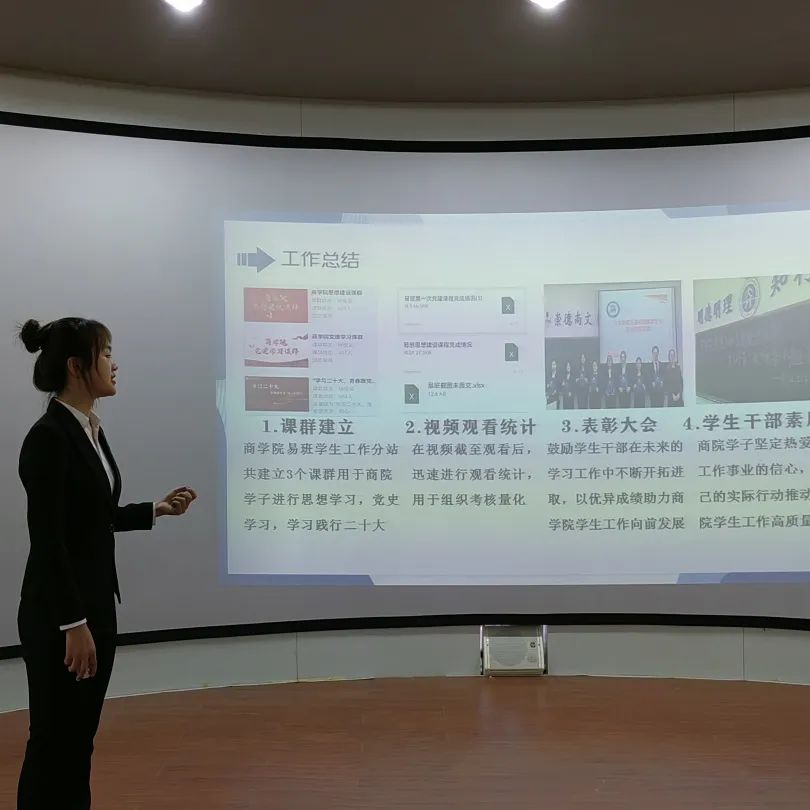 决赛中,参赛选手围绕自我简介、工作总结、收获成长、未来展望等方面,结合PPT展开精彩演讲,充分展现了学院学生干部的青春风采。评委老师对参赛选手的事迹材料、答辩内容及现场表现进行评价。