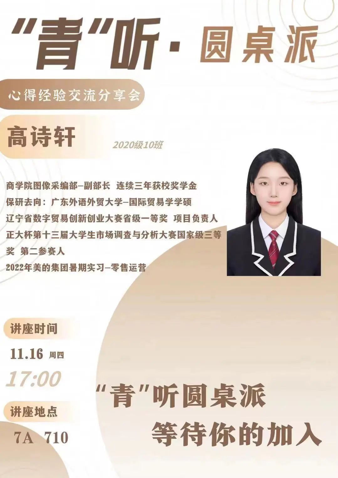 高诗轩,优秀团员,2020级10班国际经济与贸易专业,连续三年获校奖学金,已成功保研至广东外语外贸大学。曾担任桃子视频