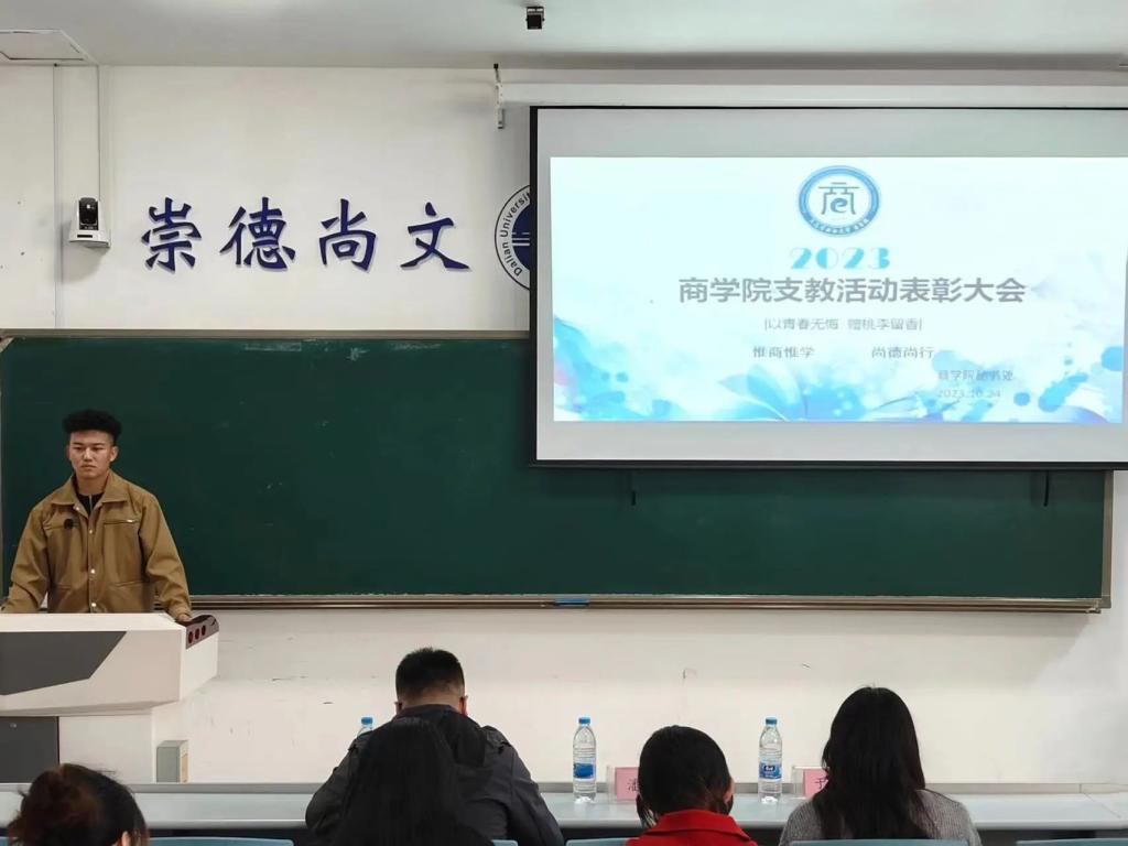于明德楼101教室召开“以青春无悔,赠桃李留香”支教表彰暨本学期“提灯引冬路,妙笔筑梦成”冬季支教活动动员大会。本次会议由秘书处成员呼延洋子同学主持,辅导员潘博、于子舰、于子容及全体志愿者参加此次会议。