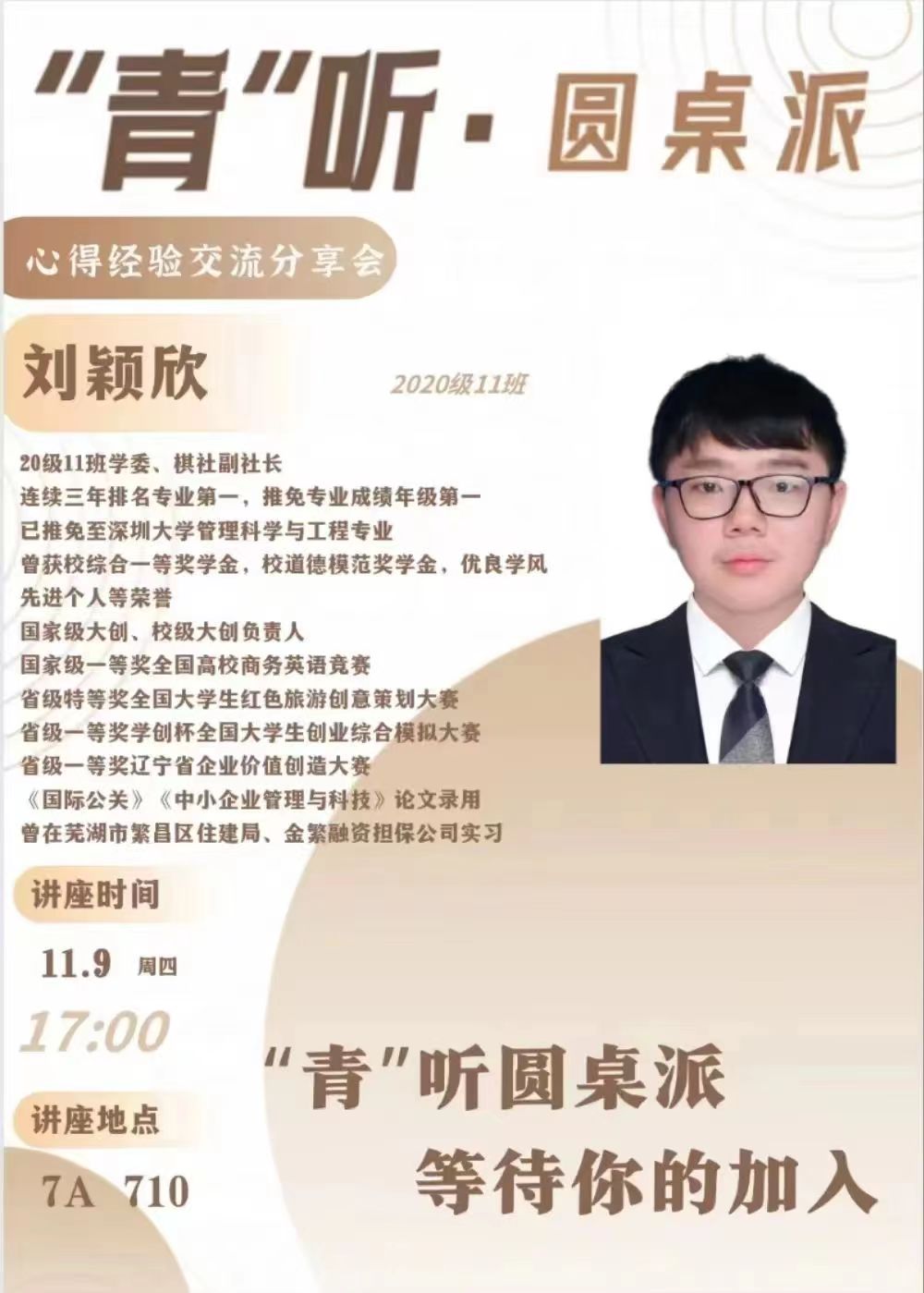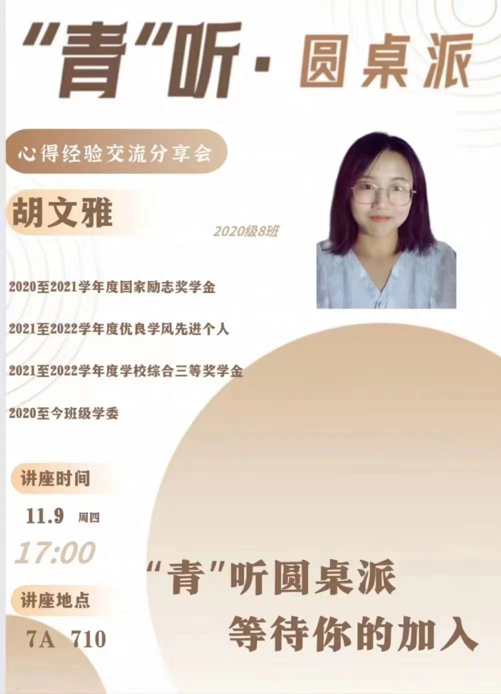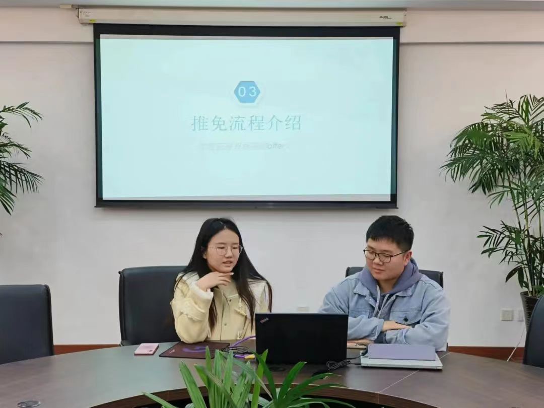 于励学楼710教室开展“青”听•圆桌派保研经验分享会,本次分享会由20级胡文雅和刘颖欣同学主讲。