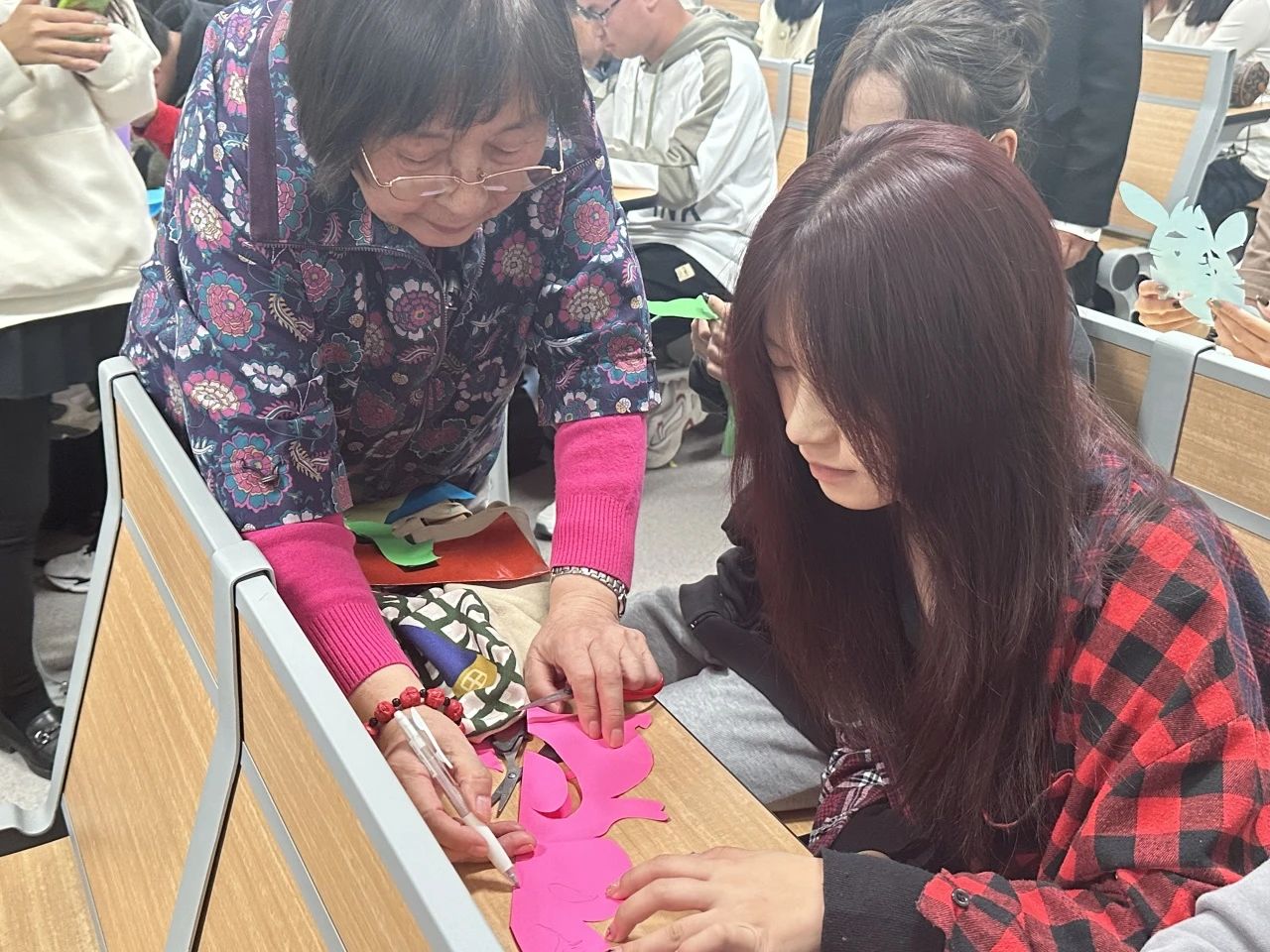 本次课程由苏娅倩老师主持,邀请国家级非物质文化遗产项目庄河剪纸代表性传承人韩月琴及第四代传承人朱有立作为主讲人,我院100余位同学参与,共同体会中国非物质文化遗产的独特魅力。