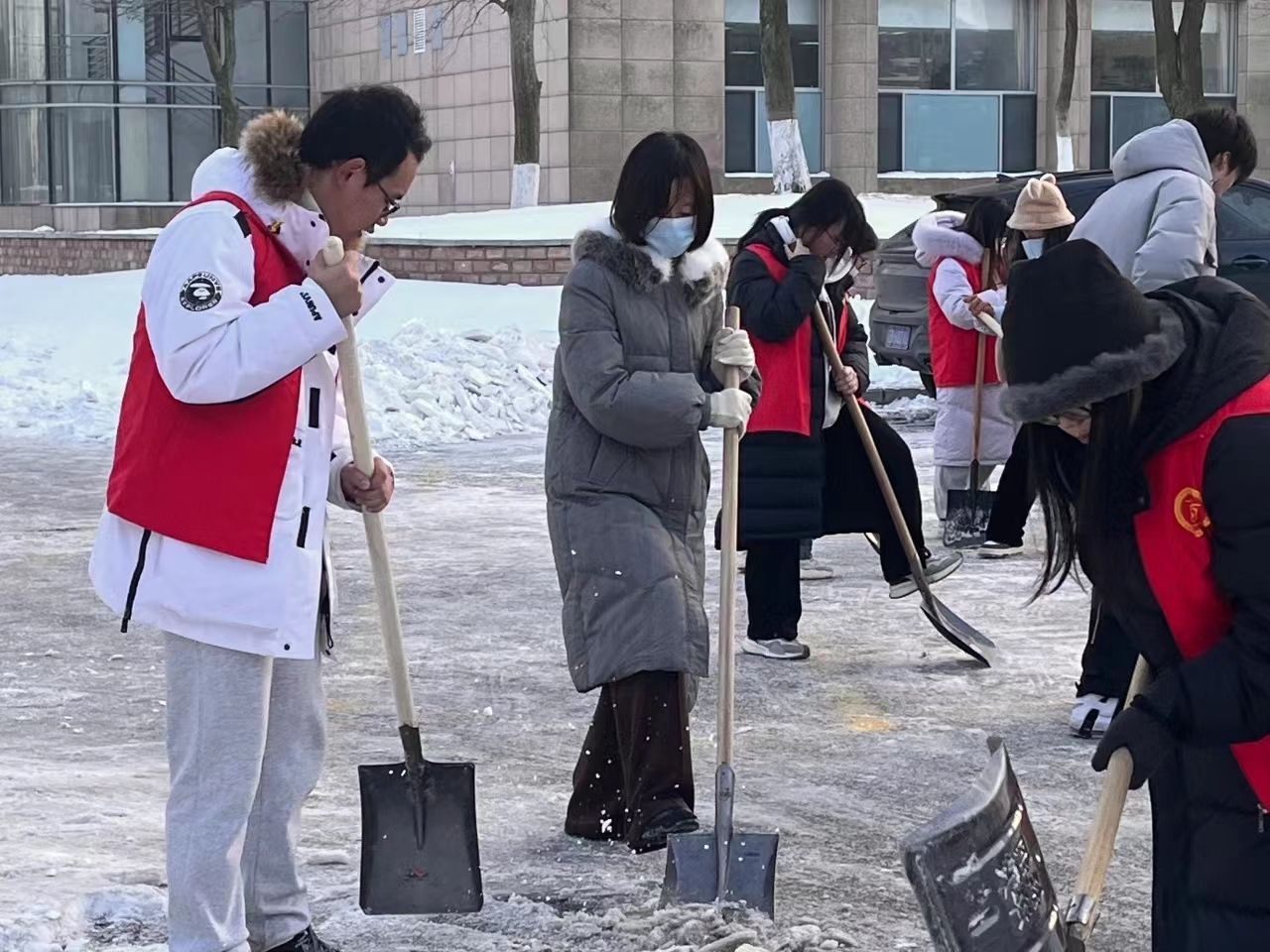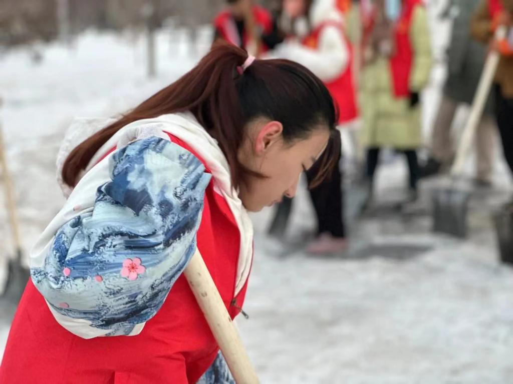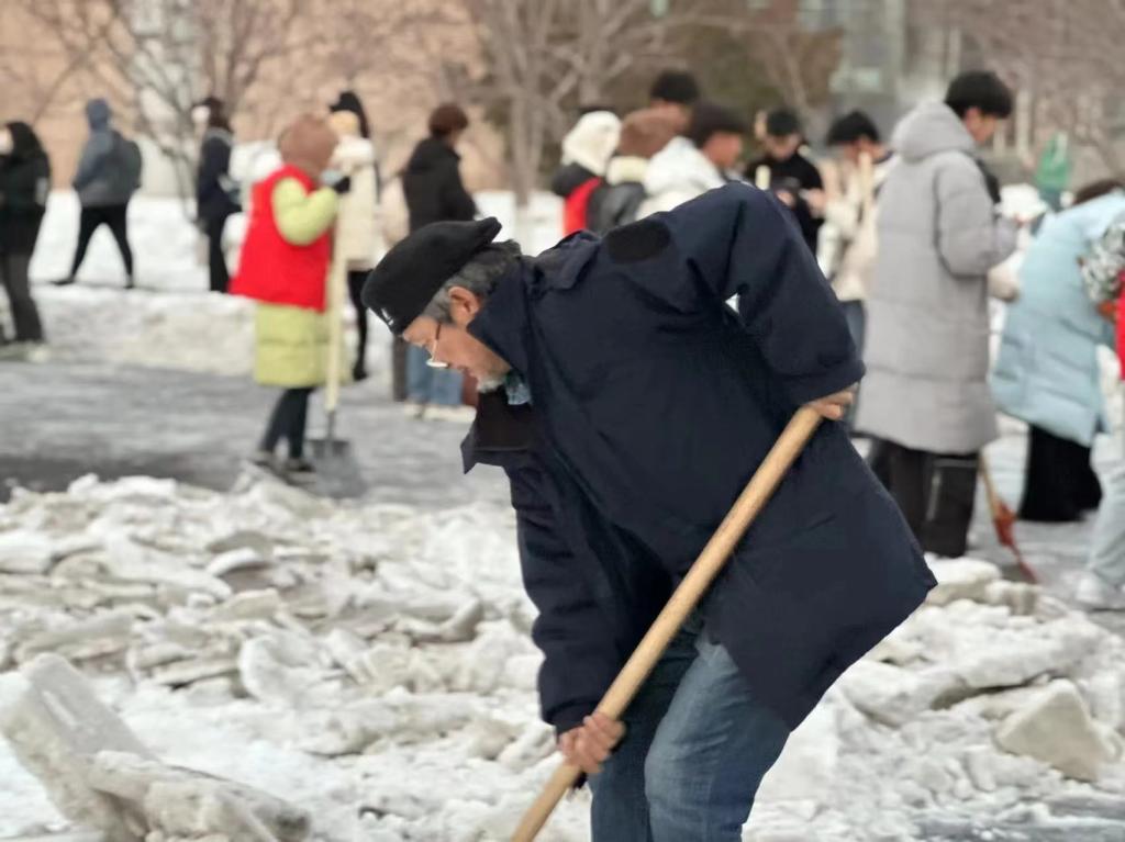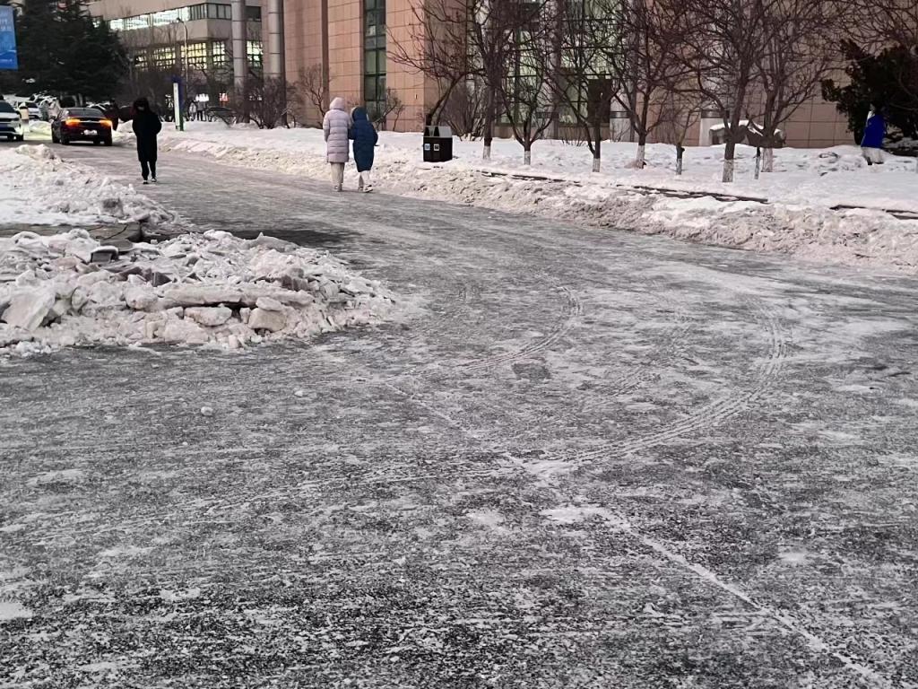 因暴雪天气导致校园主干道积雪覆盖,加之通行人流量大、来往车辆多,积雪紧实附着地面,结冰现象尤为严重。此次铲冰活动在前期扫雪的基础上,针对背阴处5~10厘米冰层路面进行针对性清理。志愿者明确分工,手持铁锹、除雪铲等工具,不惧严寒,近三个小时的铲冰工作,原本结冰湿滑的路面得到清理,为师生的安全出行提供了强有力的保障。