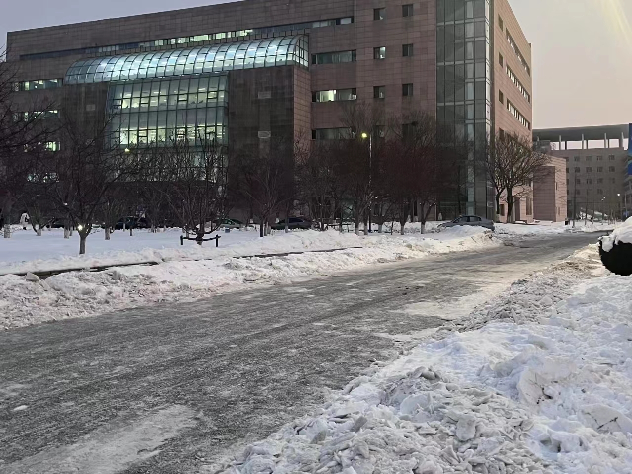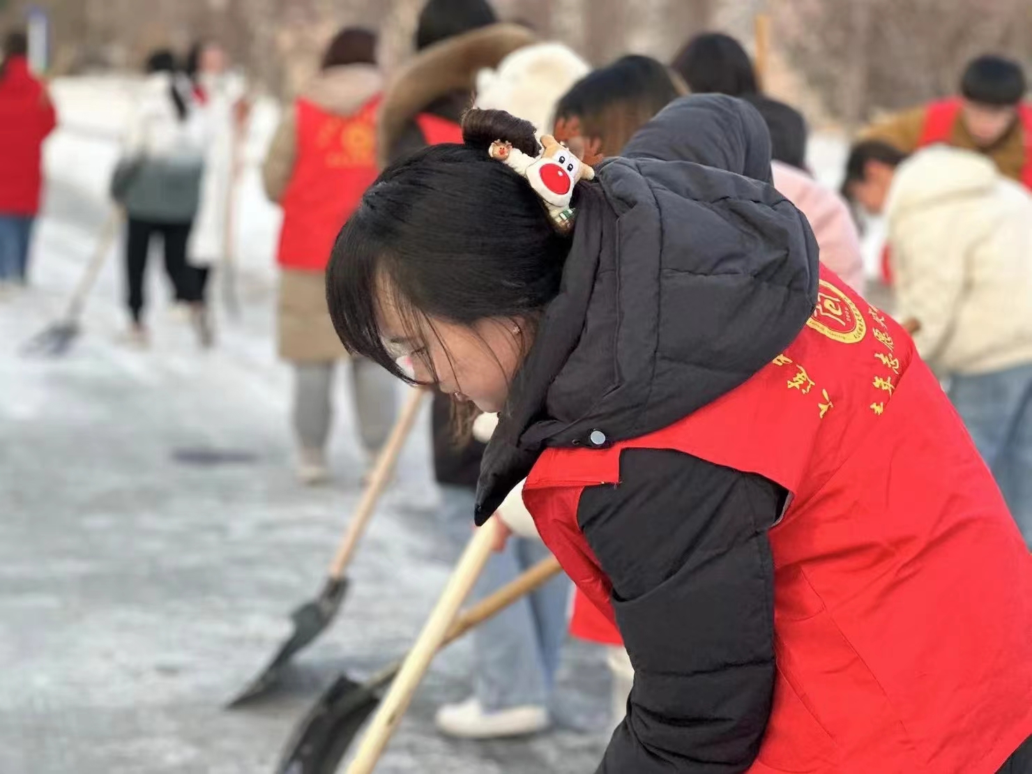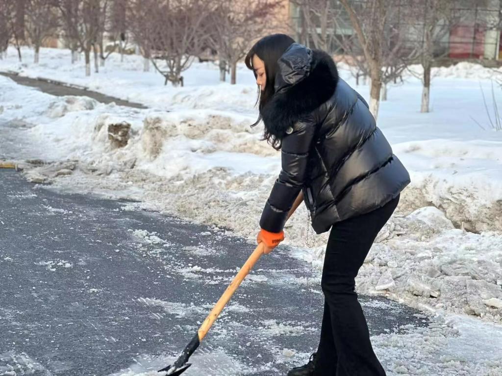因暴雪天气导致校园主干道积雪覆盖,加之通行人流量大、来往车辆多,积雪紧实附着地面,结冰现象尤为严重。此次铲冰活动在前期扫雪的基础上,针对背阴处5~10厘米冰层路面进行针对性清理。志愿者明确分工,手持铁锹、除雪铲等工具,不惧严寒,近三个小时的铲冰工作,原本结冰湿滑的路面得到清理,为师生的安全出行提供了强有力的保障。