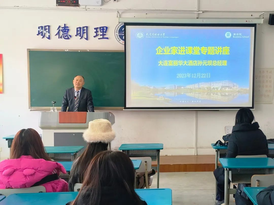为了深入推进产教融合,帮助学生明晰当下就业局势及就业热点,为学生的学业与职业规划提供引导,12月22日,大连富丽华大酒店孙元坝总经理应邀参加我院旅游管理专业召开的“企业家进课堂专题”讲座。
