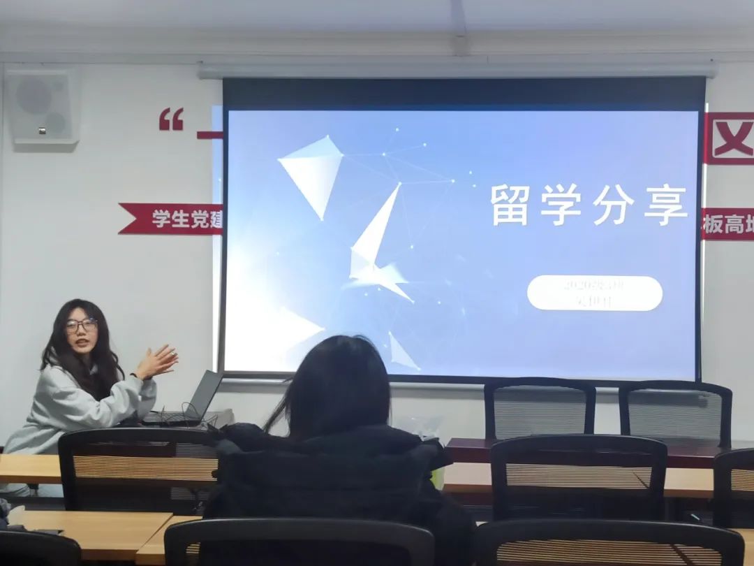 本次分享会以分享留学经验为主,吴伊佳同学以自身留学经验为例,分别从留学择校、准备内容、中介以及适合留学的人群等方面进行阐述,强调了留学对语言成绩、个人简历、绩点的要求。她鼓励同学们要积极面对大学生活,勇于试错,利用好碎片化时间和空闲时间,积极参与社会实践,从中汲取经验从而提升个人价值。
