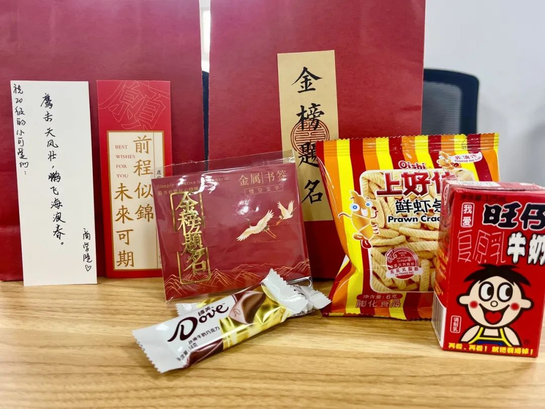 活动伊始,潘博老师为大家介绍了礼包的寓意——旗开“德”胜的德芙、运“旺”时盛的旺仔牛奶、带有祝福语的书签和明信片以及好运“佳”成的上好佳,她表示学院会在各方面为学子提供全方位的关心与支持,深切祝愿学子们金榜题名。