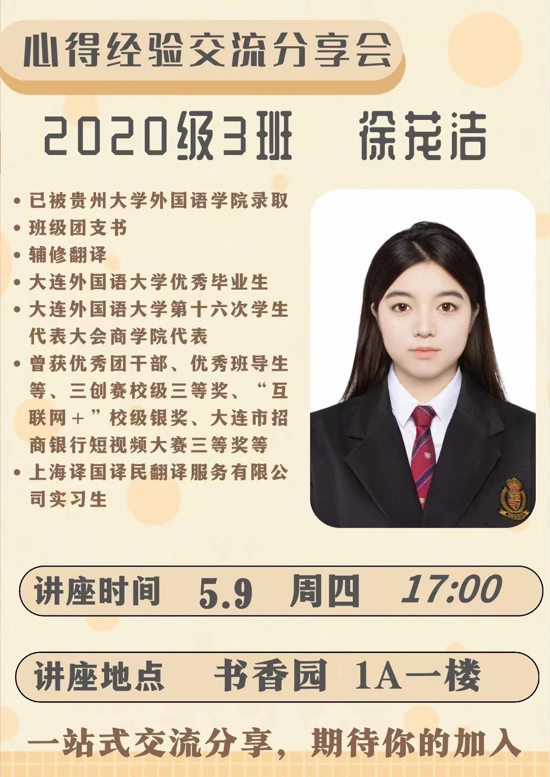 徐茏洁,2020级3班团支书,已被贵州大学外国语学院录取。曾担任上海译国译民翻译服务有限公司实习生、桃子视频