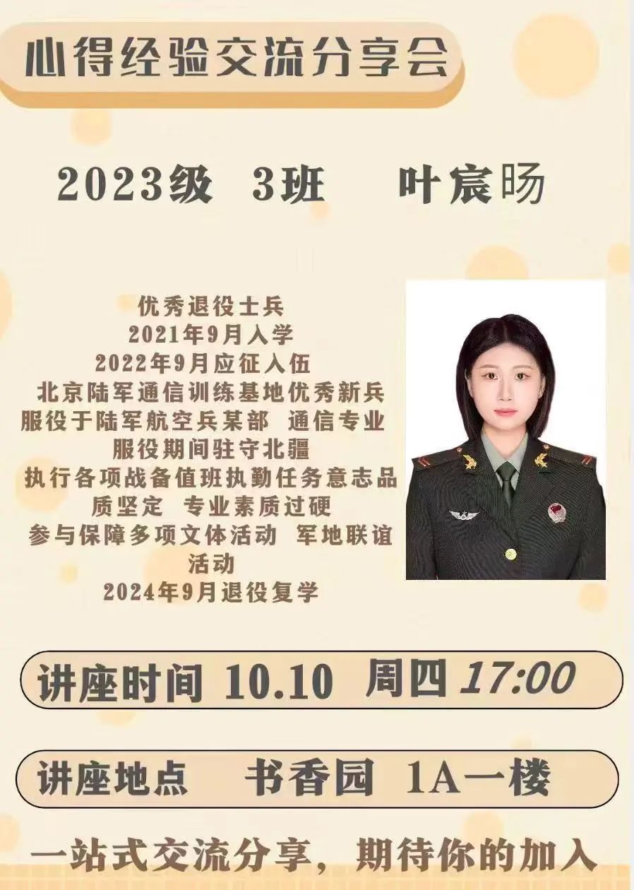 于书香园1号楼“一站式”学生社区党群活动中心开展“一站式就业引航”军旅经验分享会,本次分享会由23级3班叶宸旸同学主讲。