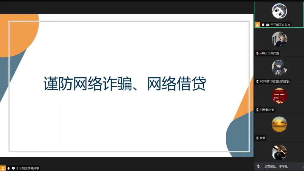 在2022级的家长会上,于子舰老师首先向家长们详细介绍了本学期同学们参与各类活动、竞赛的具体情况,以及所斩获的各项荣誉,对同学们在这一过程中的辛勤付出与显著成长给予了充分的表扬与肯定。同时,于子舰老师针对学校的奖助贷政策、出国留学的相关事宜、参军入伍的各项政策以及考研就业等问题进行了全面且细致的解读。此外,考虑到电信诈骗手段层出不穷,于老师特别提醒学生和家长务必提高警惕,时刻做好预防电信诈骗的工作。