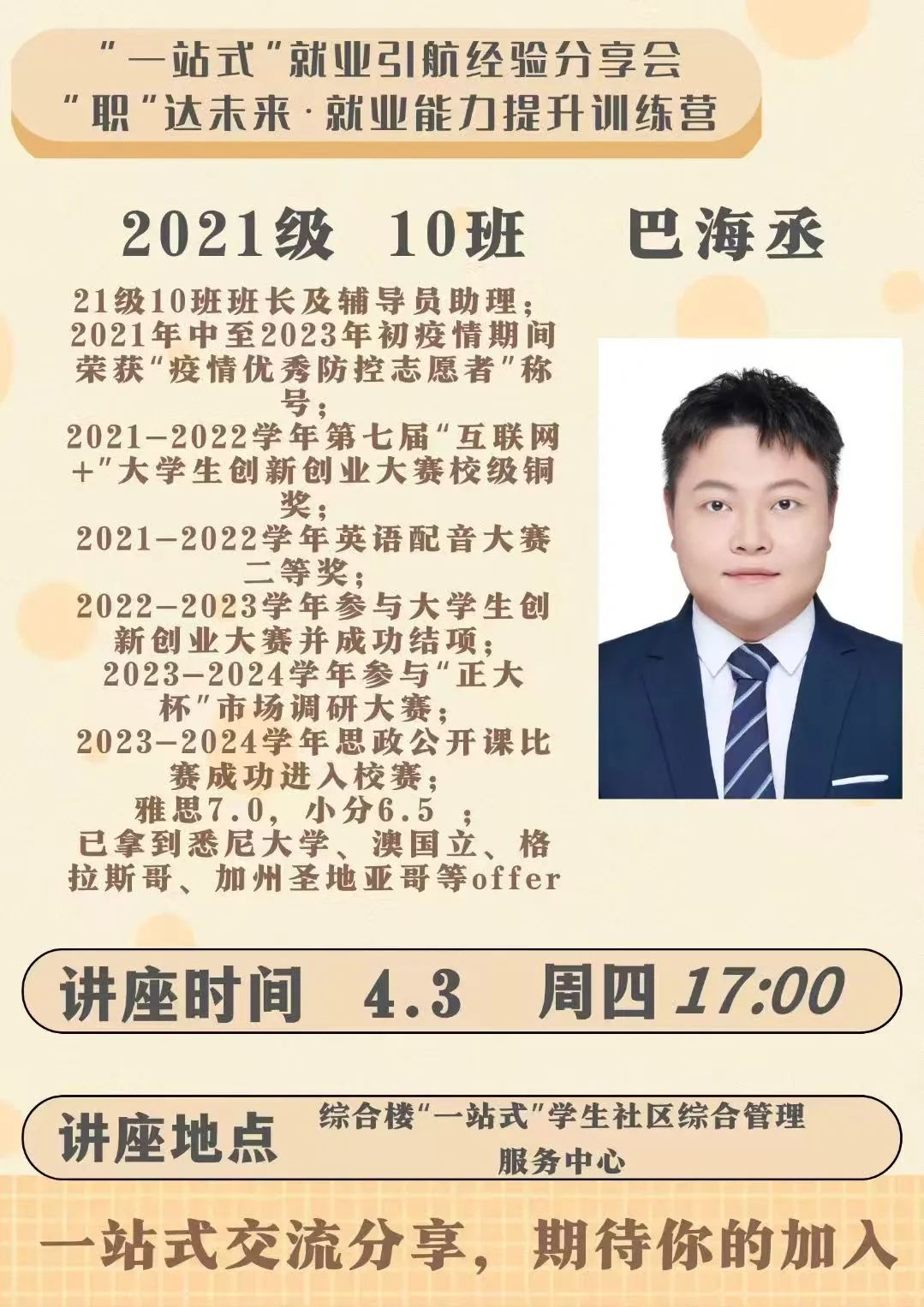 于“一站式”学生社区综合管理服务中心开展“一站式”就业引航“职”达未来就业能力提升系列活动第二期——留学经验分享会,本次分享会由21级10班巴海丞同学主讲。
