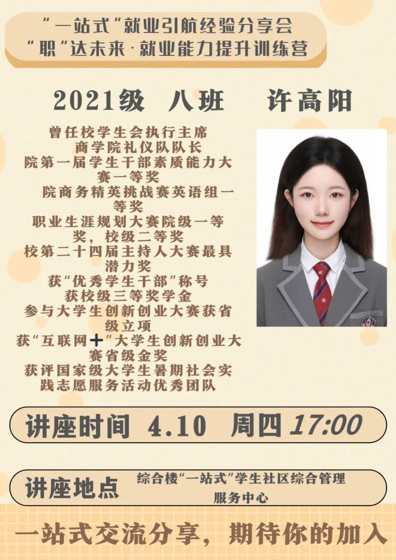 于“一站式”学生社区综合管理服务中心开展“一站式”就业引航“职”达未来就业能力提升系列活动第三期——考研经验分享会,本次分享会由21级8班许高阳同学主讲。