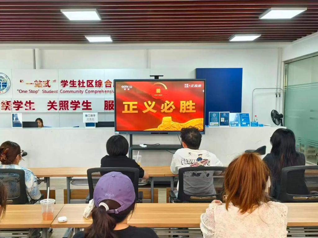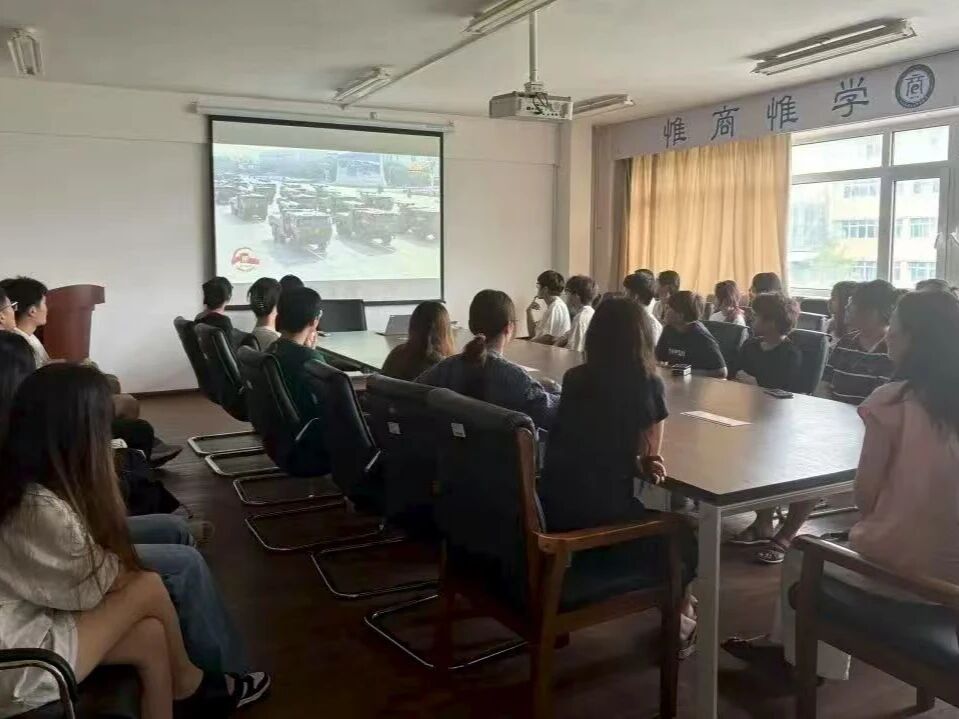 组织师生于7A410共同观看纪念中国人民抗日战争暨世界反法西斯战争胜利80周年大阅兵直播。当国歌奏响,五星红旗冉冉升起,全体师生自觉起立,齐声高唱国歌。直播过程中,师生们全神贯注,被整齐划一的受阅部队、先进精良的武器装备以及盛大庄严的阅兵仪式深深震撼,心中的爱国之情与民族自豪感油然而生。通过观看直播,师生共同回顾抗战历史,缅怀英烈,感受伟大祖国的强大力量。
