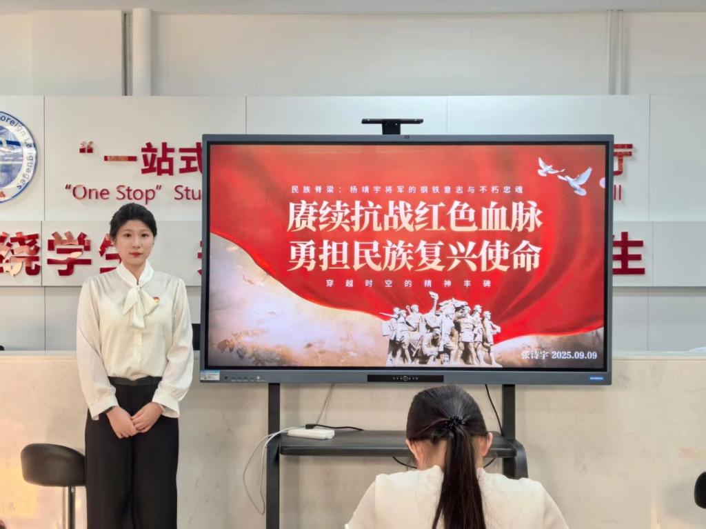为了进一步学习抗战精神中天下兴亡、匹夫有责的爱国情怀,视死如归、宁死不屈的民族气节,不畏强暴、血战到底的英雄气概,百折不挠、坚忍不拔的必胜信念,学院组织开展致敬抗日英雄系列分享会。9月9日组织学生党员张诗宇同学开展“赓续抗战红色血脉 勇担民族复兴使命”杨靖宇将军英雄事迹分享会。分享中,从“九一八事变”的时代背景切入,讲述杨靖宇将军从早年投身革命、组建东北抗联,到1940年在极端困境中壮烈牺牲的历程,生动展现抗战英雄的坚定信仰与赤胆忠诚。