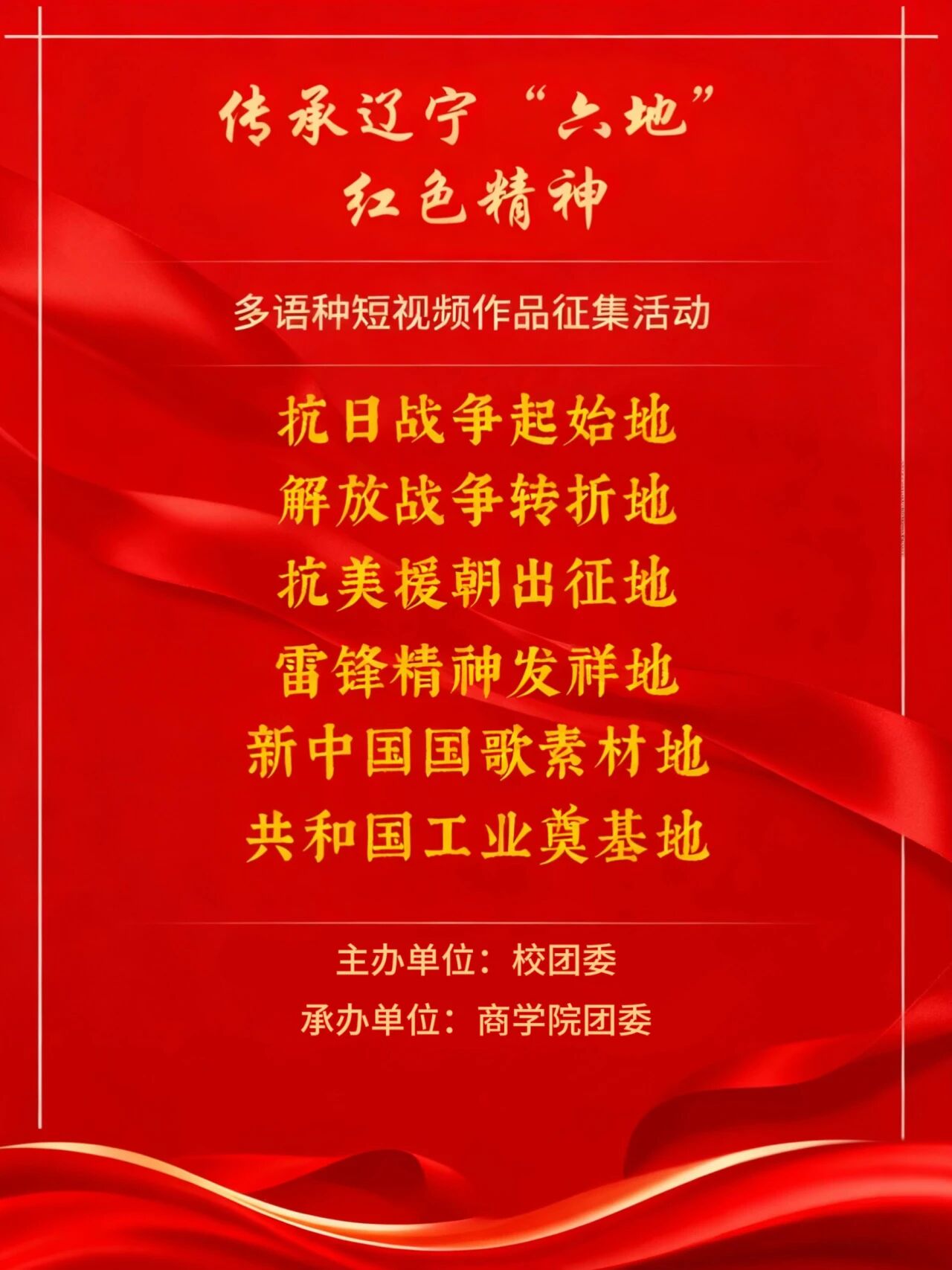 为深入阐释辽宁“六地”红色文化的丰富内涵和时代价值,追寻辽宁红色足迹,传承红色精神,依托我校以外语为主、国际化办学的特色,现开展传承辽宁“六地”红色精神多语种短视频作品征集活动,引导青年学子深入挖掘、生动讲述辽宁红色故事,让“六地”红色基因融入血脉,为新时代“六地”建设凝聚振兴发展的青春力量