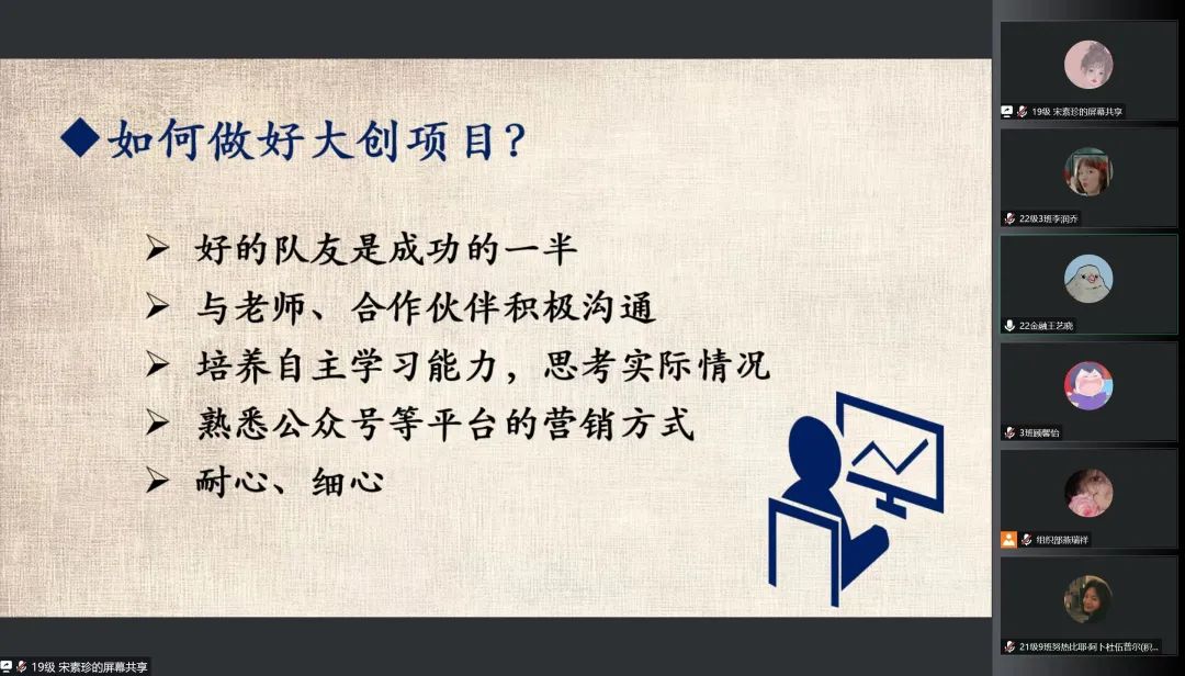 在本次分享中,宋素珍同学结合自身项目工作经历和学习经验,就参加创新创业类比赛、考研择校等方面,为同学们提供了详细的介绍和分享。