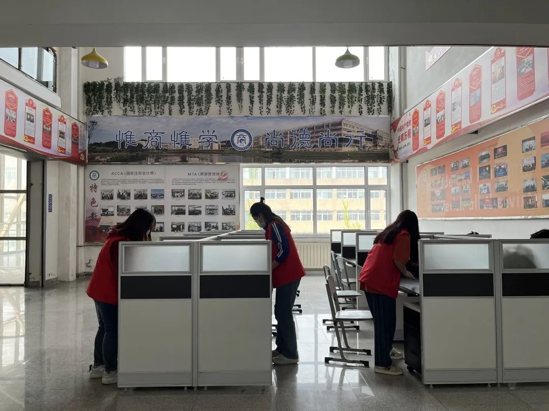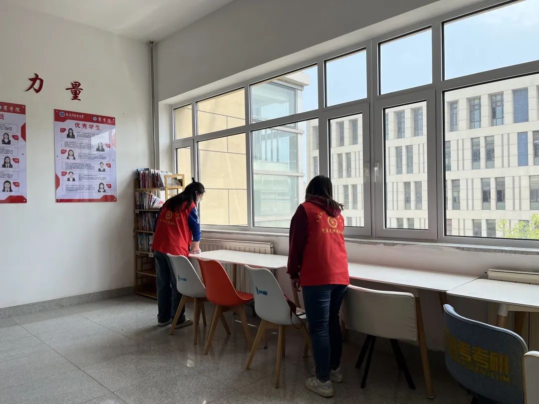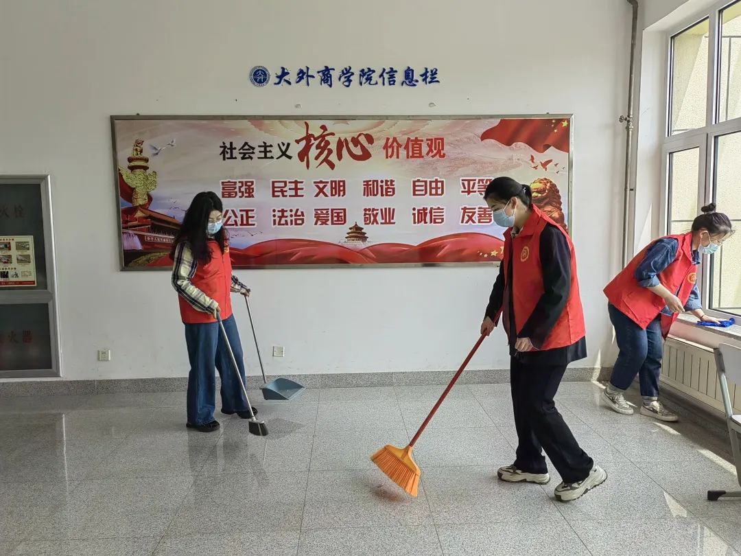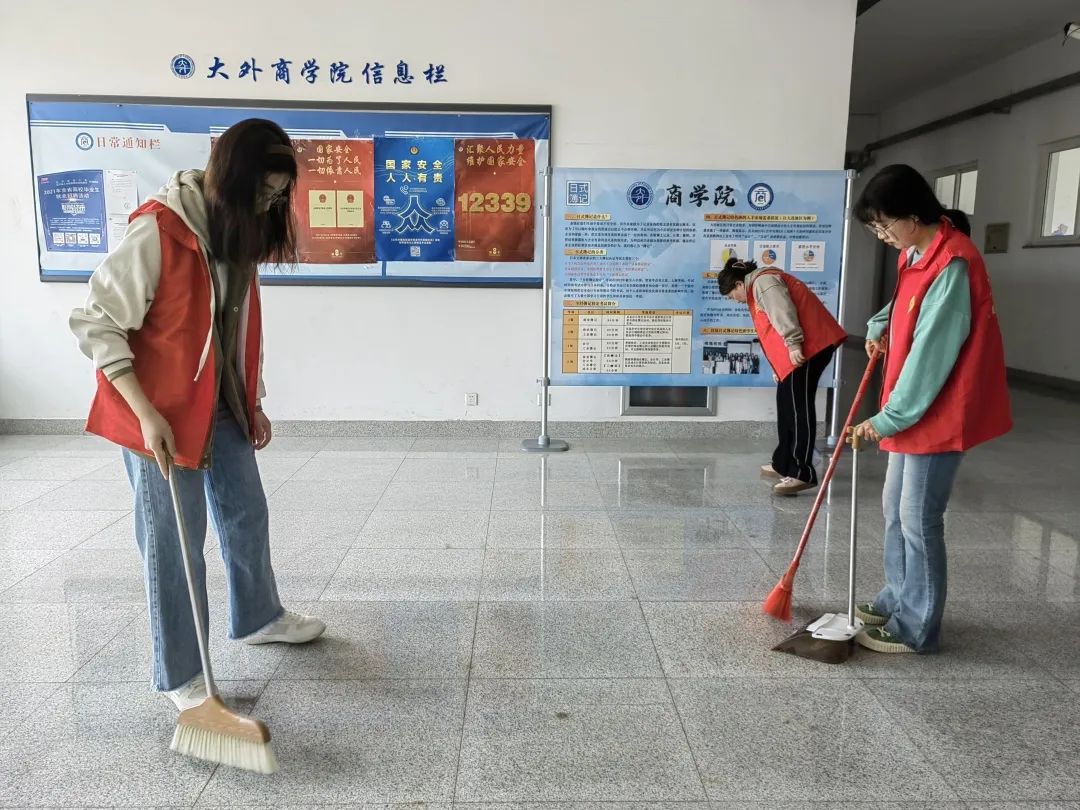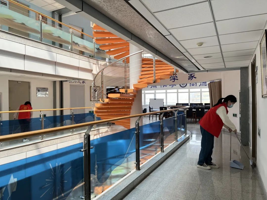 活动中,学生党员们统一身着志愿者服,准时整队集合、领取清扫工具,穿梭在励学楼的每个角落,对每个区域都进行了细致的打扫。