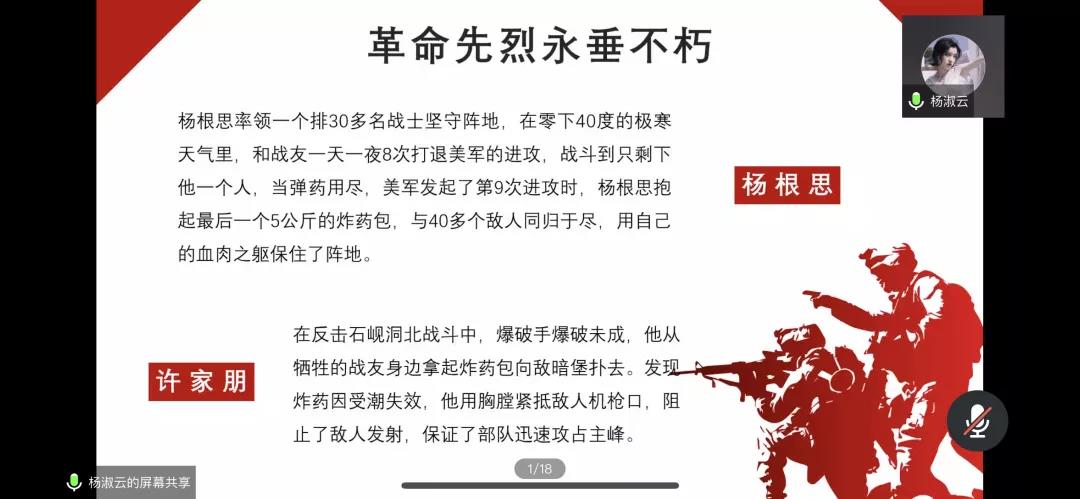 杨淑云向我们讲述了抗美援朝战争中涌现出的许多志愿军英雄,杨根思、许家朋、邱少云等革命先烈的光辉事迹。她倡导大学生应主动学习抗美援朝精神,向最可爱的人致敬,将爱国主义精神深植于心,将个人理想融入爱国实践,用13亿多人民的智慧和力量,汇聚起夺取新时代中国特色社会主义伟大胜利、实现中华民族伟大复兴中国梦的磅礴伟力。面对新时代新使命,青年人要争做时代新人,不畏困难与挑战,直面问题和短板,敢于较真碰硬,敢于攻坚克难,鲜衣怒马少年时,不负韶华行且知。