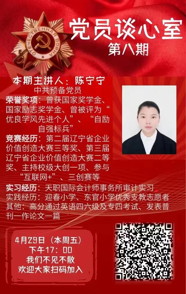 为进一步落实我校疫情防控要求,更确切地了解学生在校的思想动态和生活状况,在本期党员谈心室活动中,学生党员下沉到寝室,以线上线下相结合的方式开展此次活动,积极营造健康良好的宿舍学习环境。本期的党员谈心室活动我们有幸邀请到了19级中共预备党员陈宁宁,现在让我们一起聆听她的精彩分享吧。