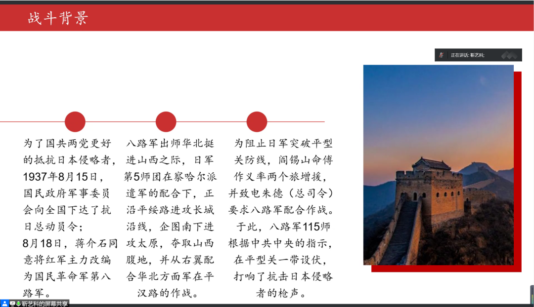 本期的党员谈心室,靳艺科首先讲述了太行精神。太行精神是国家和民族处于危亡的关键时刻,太行儿女所展现的勇敢、顽强、无惧艰难的革命英雄主义精神。它是在极其艰苦的条件下的百折不挠、艰苦奋斗,是为了人民利益的勇于牺牲、乐于奉献,是数千年来中华民族精神的积淀和延续。而后,靳艺科从战斗背景、战斗部署、英雄事迹、历史影响等方面介绍了平型关大捷。平型关大捷是八路军出师华北抗日战场后的首战大捷,也是全国抗战爆发以来中国军队的第一个大胜利。它粉碎了“日军不可战胜”的神话,振奋了全国人心,鼓舞了全国人民的抗战热情。平型关是英雄的关,它浸染了无数先烈的鲜血;平型关是胜利的关,它承载了中国人民同仇敌忾、英勇不屈的伟大精神。