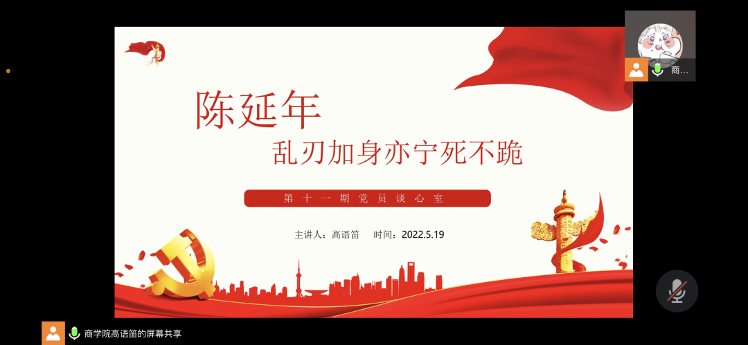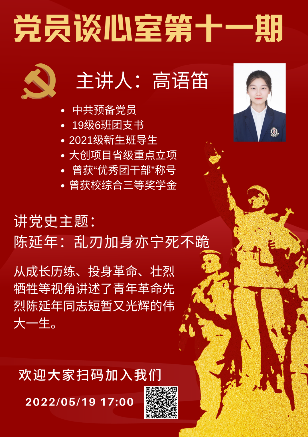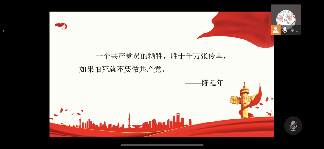 本期党员谈心活动,高语笛分享的党史主题是“陈延年:乱刃加身亦宁死不跪”。她从成长历练、投身革命、壮烈牺牲等方面讲述了青年革命先烈陈延年同志短暂而光辉的一生。陈延年曾说,一个共产党员的牺牲,胜于千万张传单,如果怕死就不要做共产党。这句话激励了千千万万的共产党员,更加坚定了他们不惧牺牲、勇于献身的信念和无私的追求。陈延年从小便下定决心以革命党人为榜样,他是坚持原则的“小列宁”。在革命时期他虽担任了党内的高级领导职务,但他对自己的日常生活依然坚持朴素的原则,他是革命的“苦行僧”。当陈延年被国民党军突然逮捕后,遭受敌人严刑拷打的他始终未吐一言,坚决维护中国共产党。他那宁死不屈,不畏牺牲,为中国共产党献身的精神将永远被广大人民群众牢记,这种精神也无时无刻不激励着千千万万的共产党人不忘国耻,铭记历史,珍惜和平,为实现中华民族伟大复兴而不懈奋斗。