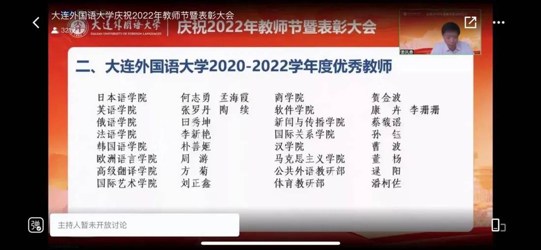 教工党员也在各类评选中获得了多项荣誉,宋刚、姜滨滨、刘鸿雷、孙梁、迟铮、艾永芳、柳志南评选为辽宁省“百千万人才工程”“万”层次人才,孙梁和马琳分别于2020年和2022入选大连市高层次人才,获青年才俊称号;贺金波先后获评桃子视频