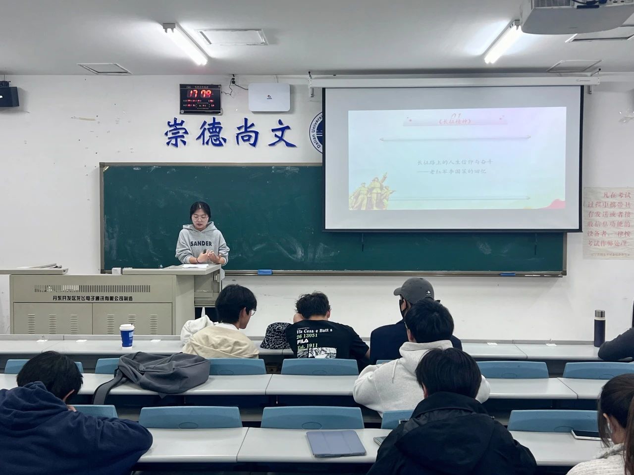 本期活动中,张严严同学以“百年长征,忆万里长征精神”为主题,带同学们详细回顾了长征的万里路途。1934年,第五次反围剿失利,中央主力红军被迫实施战略性转移,途中红军历经四渡赤水河、抢渡金沙江、飞夺泸定桥等多次存亡危机;又在草地与雪山当中面临体力不支,缺乏食物等困境。但红军凭借坚定的革命信心与斗争热情,最终克服种种困难,胜利会师,完成人类历史上一大壮举。张严严同学的分享加深了同学们对于伟大长征精神的理解,鼓励同学们坚定理想信念,在新时代传承长征精神。