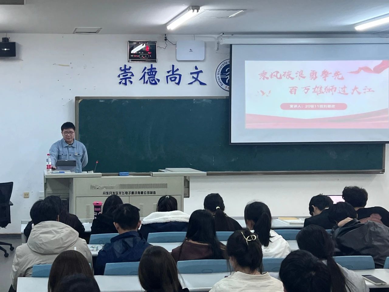 在本期活动中,刘颖欣同学以“乘风破浪勇争先,百万雄师过大江”为主题,向同学们介绍了解放战争时期规模巨大、意义深刻的渡江战役。随着三大战役胜利结束,以毛泽东主席为首的中国共产党人在“和平谈判”破裂后,决定指挥百万大军发起渡江战役,夺取国民政府反动政治中心南京,解放全中国。在战役中,党领导人民解放军克服了帝国主义干涉、长江天堑等种种困难,在人民的支持下仅历时四十二天就取得了胜利。此次战役解放了华东的大部分地区,加速了解放全中国的进程。该战役展现出来的人民解放军英勇顽强的战斗精神鼓舞着后世千千万万个中华儿女继承先辈的英勇意志,为谱写新时代伟大宏图而不懈奋斗。