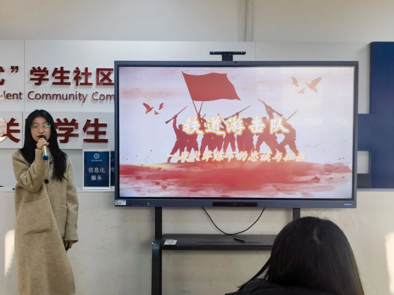 马芳同学以“铁道游击队——战火淬炼下的忠诚与担当”为主题,向同学们讲述了铁道游击队的故事。她向大家科普铁道游击队成立于1940年,由鲁南地区铁路工人、农民等组成,是著名抗日武装,其故事被改编成多种作品。随后以两个章节展开。在“沙沟受降”部分,介绍了1945年日本投降后,当地日军拒绝向铁道游击队缴械,朱德总司令发布命令后,部分日军最终投降的经过,展现了中国人民抗战的胜利。在“女英雄——‘芳林嫂’”中,指出“芳林嫂”原型有刘桂清、黄雪英、郝贞几人,并着重讲述了刘桂清从参加革命、担任交通员,到传递情报、保护干部、支援部队,再到抚养烈士子女、保护老干部的英勇事迹。最后,她还向大家分享了电影《铁道飞虎》,它以趣味方式重现游击队故事,令人印象深刻。