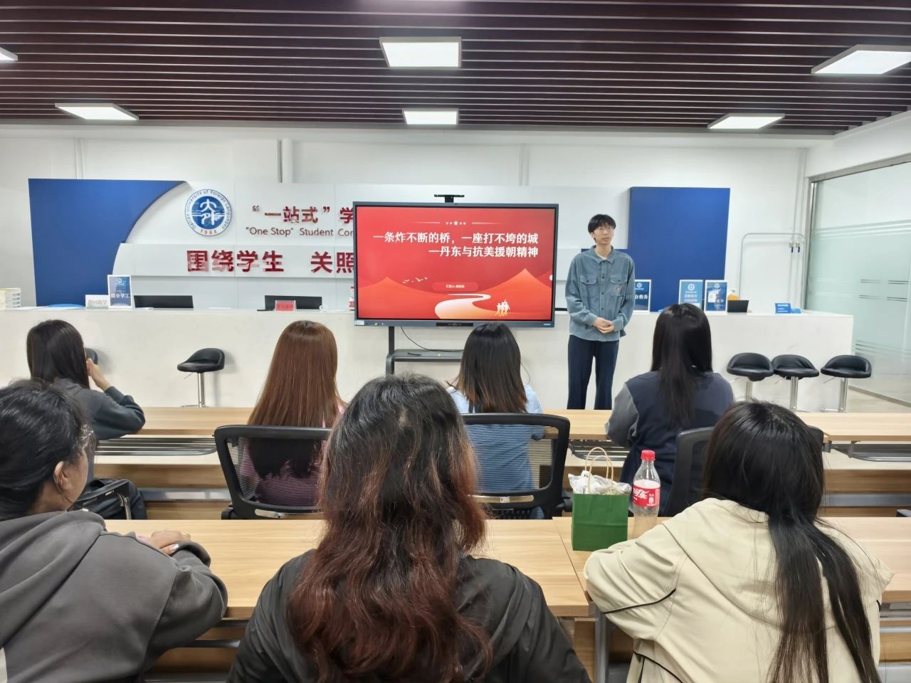 顾崇翌同学以“一条炸不断的桥,一座打不垮的城——丹东与抗美援朝精神”为主题展开分享。他先介绍了鸭绿江断桥和中朝友谊桥,前者由日本朝鲜总督府铁道局所建,1909年动工,1911年竣工,1950年11月被美国空军炸断后中方一侧四孔残桥留存;后者始建于1937年4月,1943年4月竣工,是日本侵略者为修建安奉复线铁路所建,两桥凸显丹东地理位置在战争中的重要性。接着讲述1950年朝鲜半岛内战爆发美国介入后,处于建国初期社会主义改造中的丹东成为志愿军重要渡江点与大后方,虽遭“联合国军”不断空袭,但丹东人民毫不退缩。丹东人民在战争期间贡献巨大,民众踊跃捐赠物资支援前线;众多市民加入志愿护理队伍照料伤员;努力开展后方生产保障物资供应;丹东还成为战略物资集散中心,承担后勤补给、接收国际援助、运输分配物资及医疗物资中转等任务。此外,丹东人民将“家国情怀”具化为日常行动,工人、妇女、学生、少数民族等用行动诠释民族精神内涵。