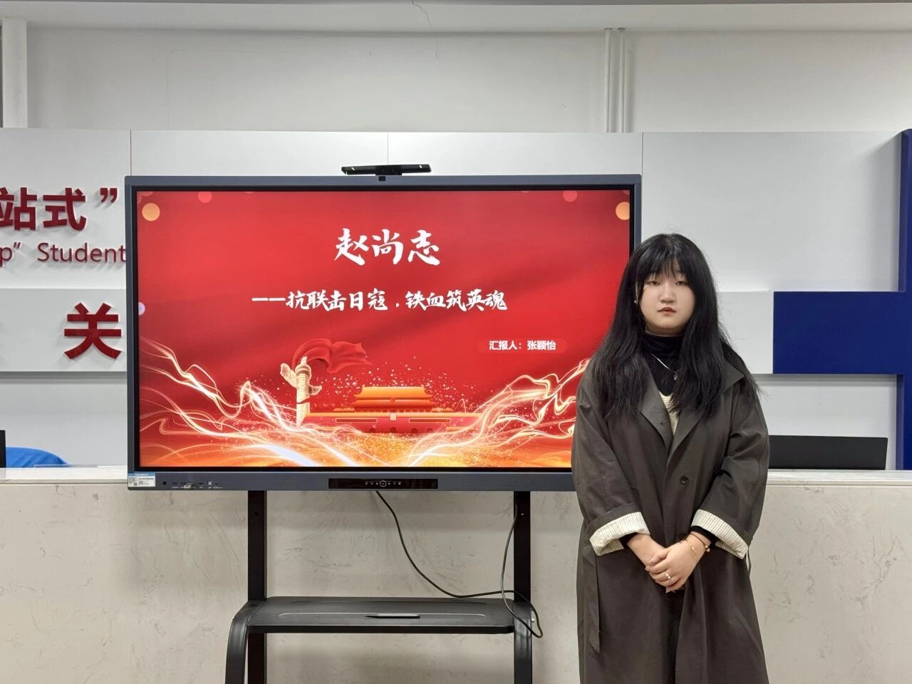 张颖怡同学以“赵尚志——抗联击日寇,铁血筑英魂”为主题,向同学们讲述了革命烈士赵尚志的故事。赵尚志是东北抗日联军创建人和领导人之一,他于1925年加入中国共产党,在东北地区参与反帝反军阀的革命活动。1937年3月,赵尚志在带领队伍转移时被敌人紧追不舍,他利用当地地形,提前设伏,最终一举歼灭日军。1937年4月,赵尚志率队遭遇日军合围。他沉着判断战局,制定战术,身先士卒,成功带领部队跳出合围圈。这些战役不仅粉碎了敌人计划,更极大提振了东北抗联的士气。赵尚志的革命生涯曾两度蒙受冤屈,却始终未改抗日初心。1940年,赵尚志遭人诬陷,被中共北满省委永远开除党籍。但他仍带着“没有党籍,我仍是共产党员”的信念,积极进行抗日活动。直至1942年,赵尚志被叛徒击中,最终壮烈牺牲,遗体被敌人抛入松花江冰窟时,都未能被平反。1982年,经黑龙江省委反复调查核实,终于为赵尚志彻底平反。赵尚志的事迹生动诠释了以国家利益为最高使命的精神,激励当代青年担当国家大任,以奋斗响应时代号召。