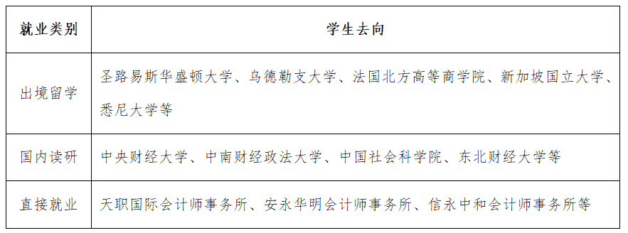 2019级毕业生就业率为94%,其中21%的毕业生选择出国留学,约12%的毕业生选择国内读研,还有约61%的毕业生选择直接就业,大部分学生实现高质量就业,均高于普通财务管理专业,也明显高于其他文科专业学生。