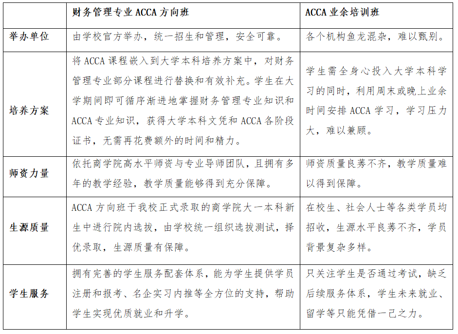 问:我校财务管理专业ACCA方向班和ACCA业余培训班有什么区别?