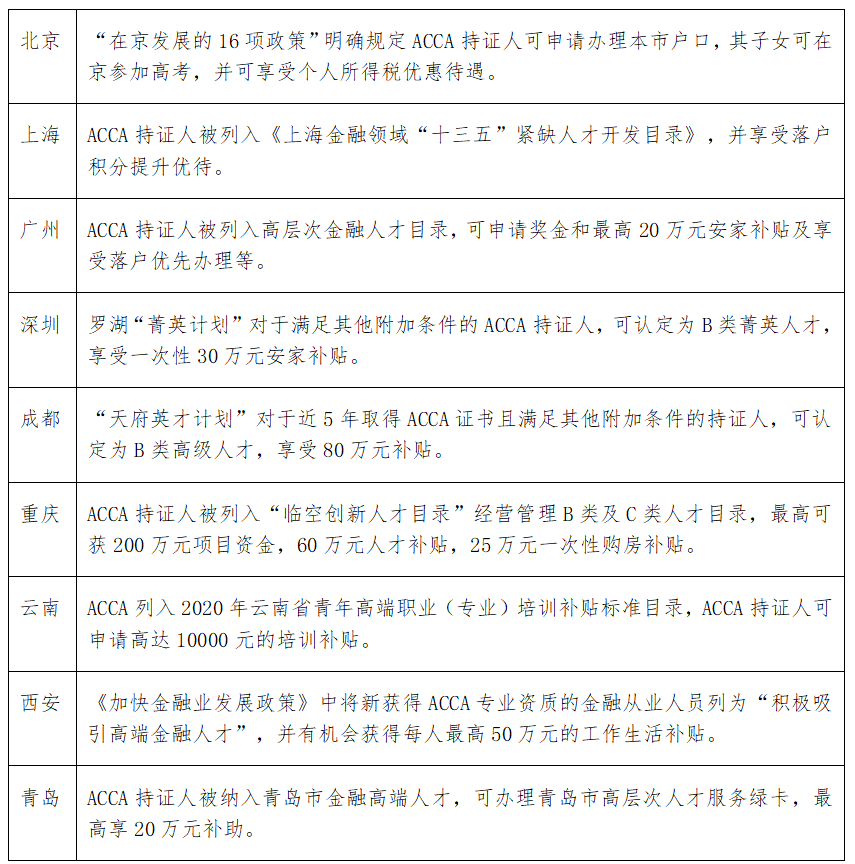ACCA会员资格在国内被广泛认可,包括北京、上海、广州、深圳、成都、西安、重庆、云南、天津、厦门、青岛、泉州、南京、南宁、宁波、福建等在内的20+省市地区政府都将ACCA持证人员列入稀缺性高端财会人才目录,并出台各项优待政策。ACCA持证人可享受诸如积分落户、个税减免、专项奖金、置业补贴、子女入学等各项优待。部分地区ACCA人才优待政策如下: